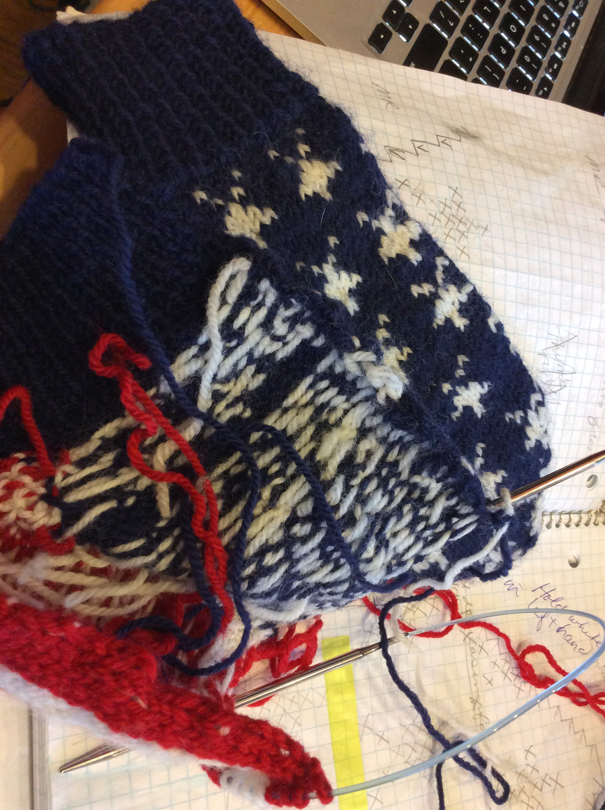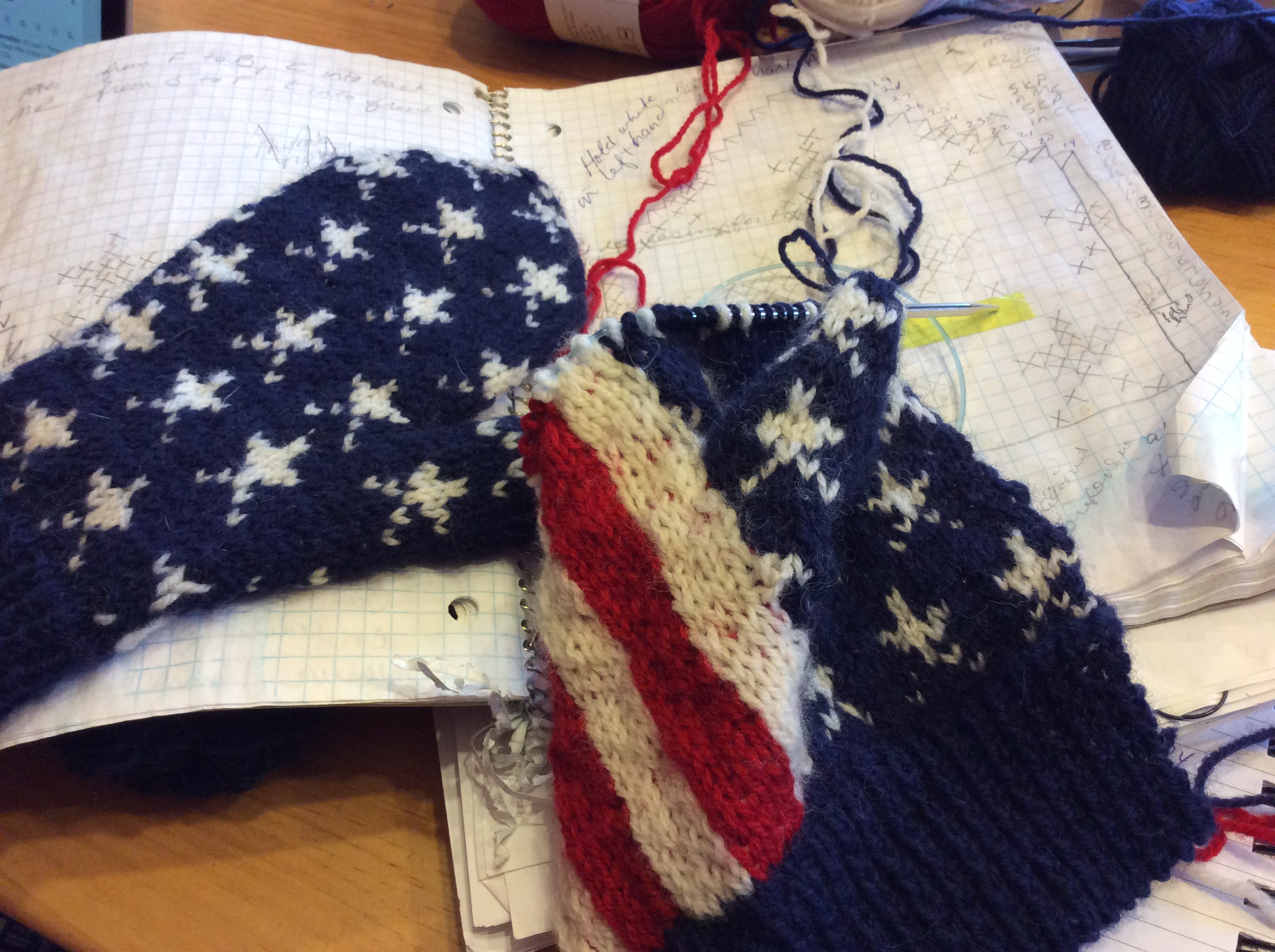 This pattern has plagued me since the last Winter Olympics. Finally, it is finished. What better name than Campaign Trail Mittens? My husband always jokes that my knitting is “work of national importance,” but voting is definitely “work of national importance,” especially this election year. With the weather turning warm climates, cold and cold climates, warm, these mittens should be useful in many states over the next month or two. Here’s a photo of the work in progress. You can find the final pattern on my Etsy site: KISSpatterns.